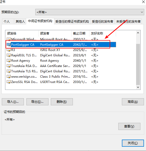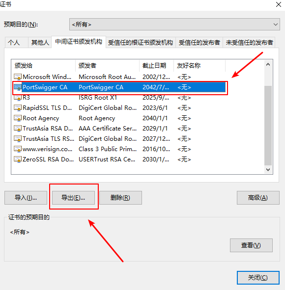7.导入后找到ProtSwigger CA,导出为PortSwigger CA.cer文件
