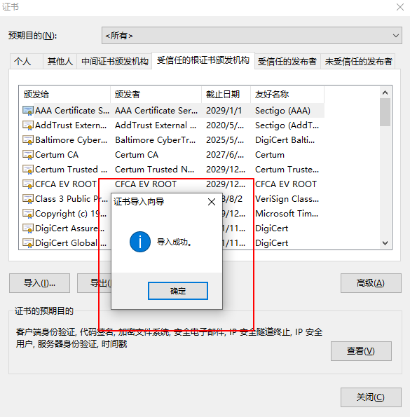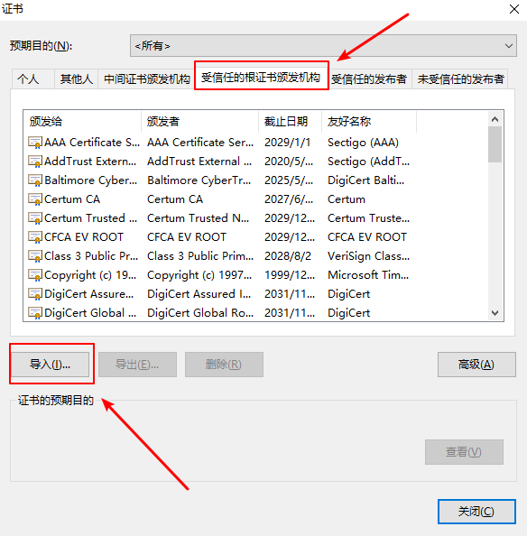 9.将此文件导入到Chrome浏览器设置中管理证书的 受信任的根证书颁发机构中