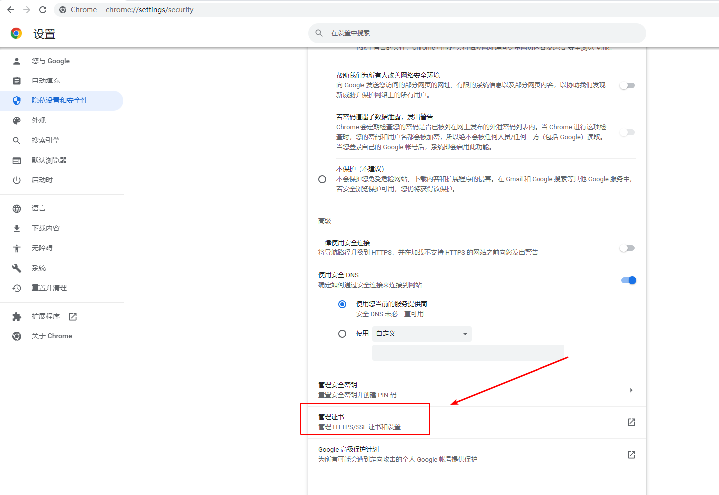 3.找到隐私设置和安全→安全