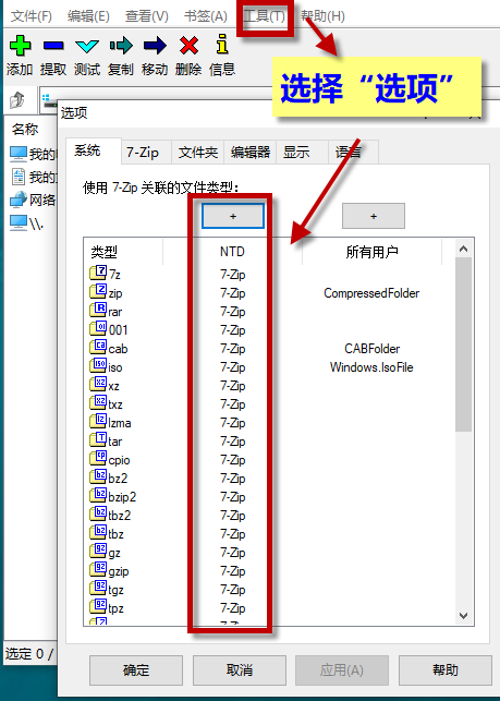 ③ 安装完后,需要对7z进行配置(工具——选项——选择需要压缩解压的文件类型)