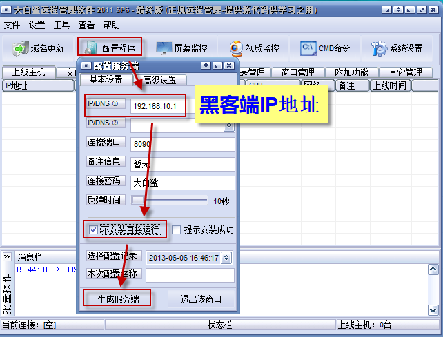 配置程序——写黑客端的IP地址——选择不安装直接运行——生成服务端