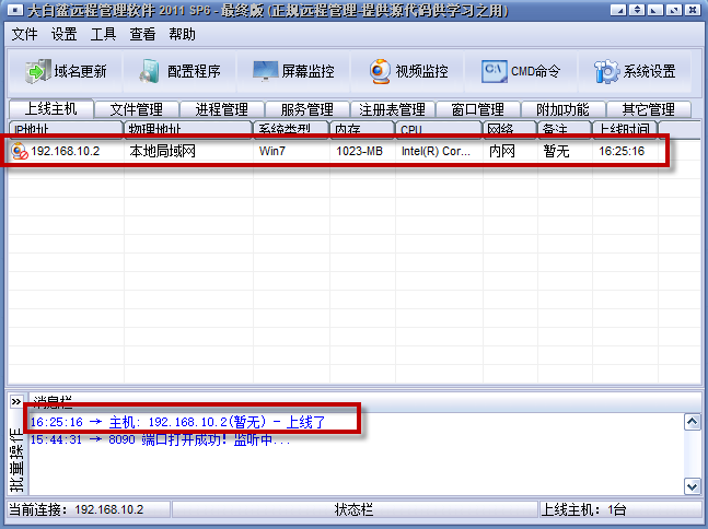 注意:会听到“有主机上线请注意”,同时在攻击机上看到有靶机上线,如下图所示