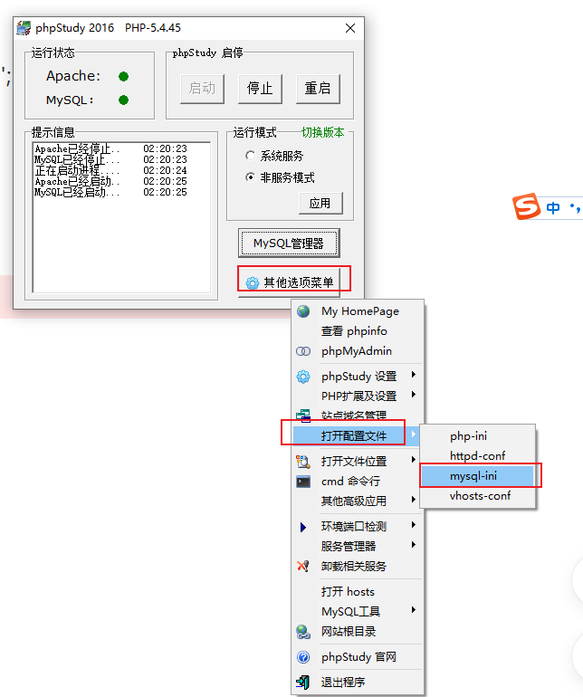 3.phpstudy中,点击 其他选项菜单→打开配置文件→mysql-ini