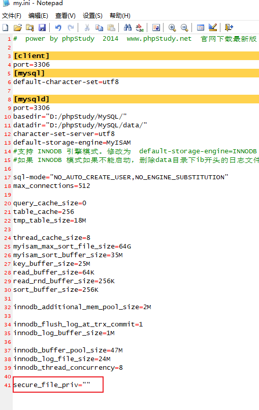 2.但是如果MySQL设置了secure_file_priv为NULL,则无法使用此函数,需要我们手动修改MySQL配置才可以